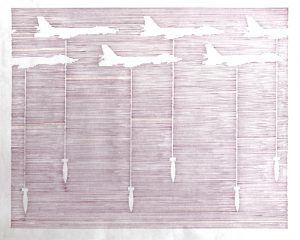 “Since 1996 outer turmoil has brought internal discord to the surface. Rants about world circumstances are echoes,” said Benedetto. “In this series of work, childish notions are paired with real world calamity. Violence against beauty. Innocence of the ‘what’s within the picket fence versus awareness of what’s outside?’ TV news versus the fluffy filling between the segments. Delicate technique versus very loud noise. The process is tiring, painstaking, frustrating, meditative. It makes silence. The OK is felt in the room. Somewhere in it, in certain moments.”