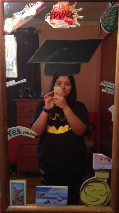 Carefully, I scanned each and every saying. I remember pulling out many pages, and after hours of cutting I had to take a break. I looked down at the pages and noticed that the pile beside me might be more than enough. I began to separate them after re-reading and only a select few made my final masterpiece. As I cut the words out and placed them around a mirror, I stared back at myself noticing that something was missing. A graduation cap! I had previously purchased a black poster board and decided to use it for the piece of resistance.